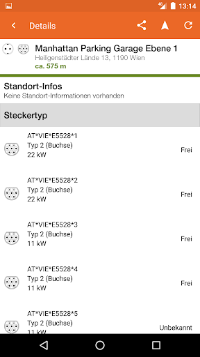 Die Detailansicht einer Ladestation liefert Ihnen nützliche Informationen wie z.B. die aktuelle Verfügbarkeit (frei/besetzt) und zeigt Ihnen die Route zur ausgewählten Ladestation an.