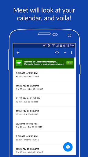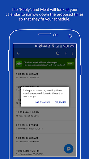 Meat is the easiest way to set up meeting times. No more typing out time slots, and say goodbye to checking your calendar while ticking those tiny boxes. This app looks at your calendar for you, and using Messenger, lets your friends or colleagues know when you're free to meet. Next comes the fun part: