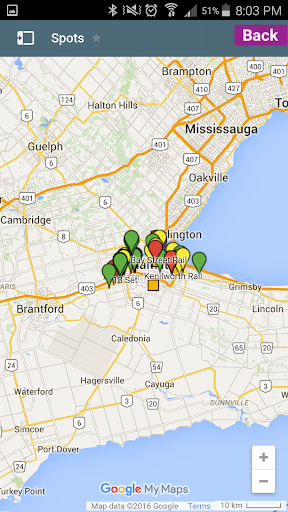 This particular app shows the user through various markers where each spot is located. Each of those markers also consists of a description for the spot. The different markers each have a meaning.