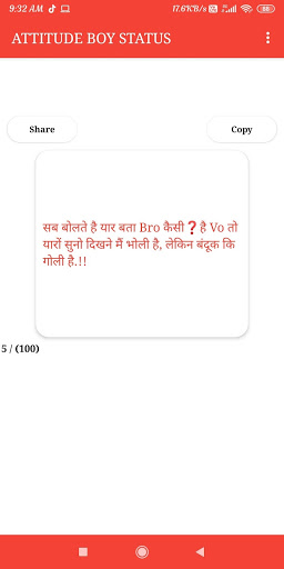 This application have hundreds of attitude statuses,You can read it easily,Save it or share to your friends.You can upload it on your fb and anywhere.