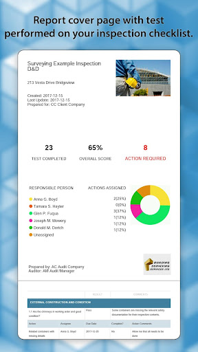 - Get a useful overview of inspection results with a visual breakdown of assignees, due dates and overall category scores.