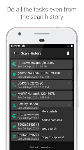 Our QR and barcode reader also keeps a history of all your scans, meaning you can scan a barcode or a QR code and find out more information about them later. Pretty handy when you want to analyze a certain product.