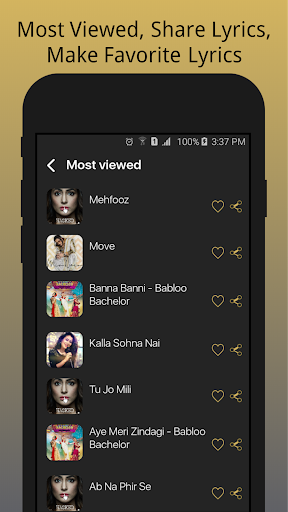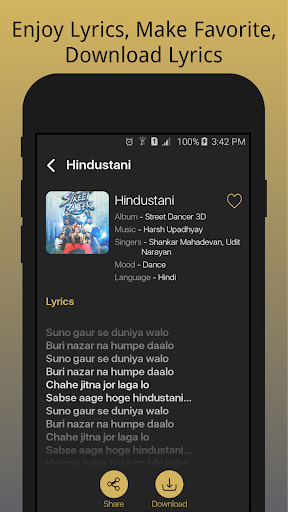 Lyricals is the best free lyrics app to download Bollywood and various non movie Album songs lyrics, It is a pure Indian app developed by Indian developers. Lyricals provides read or download lyrics of various Hindi, Punjabi, Romantic, Hip-Hop, Sad, Dance, Ghazals, Workout and other Album lyrics. It has great search lyrics options by album, singer, language and genres. It is very easy to use and find your desired lyrics.