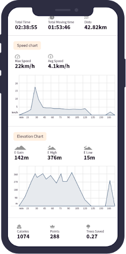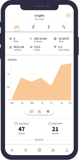 - You can track your distance, speed, elevation gained and calories burned.
