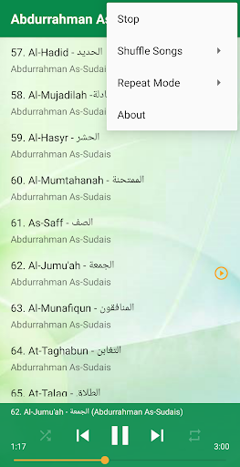 This apps show the murottal Al-Qur'ah by Syeikh Abdul Rahman Al Sudais. We can select surah which we can hear first. There are feature to pause dan play MP3. The display is very simple, yet elegant and easy to use.