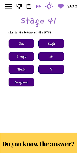 RM, V, J-Hope, Suga, Jimin, Jungkook, Jin. There are various quizzes for each member or the whole group.
