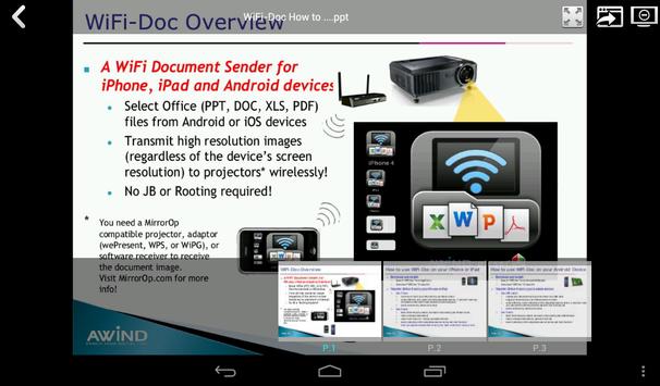 WiFi-Doc is an application that allows you to do high quality wireless presentation directly from your mobile devices to compatible receivers such as WiFi projectors, presentation gateway devices (i.e. wePresent, WiGA, WPS, etc.), or a MirrorOp enabled TVs.