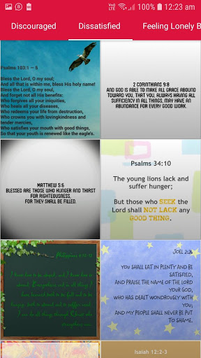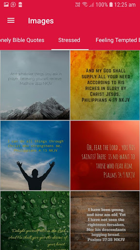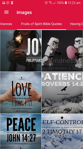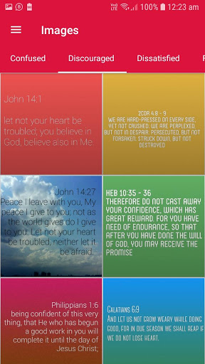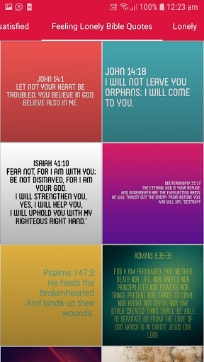 The Bible Quotes Daily app has various categories such as Confused Quotes, Discouraged Quotes, Dissatisfied Quotes, Lonely Quotes, Stressed Quotes, Fruits Of Spirits Bible Quotes, Feeling Tempered Quotes.