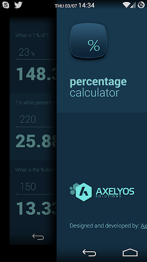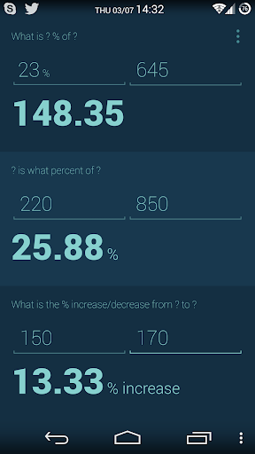 Calculate percentages with ease. Three different calculator for figuring out what is X of Y, how much percent is X of Y and what's the increase or decrease from X to Y.