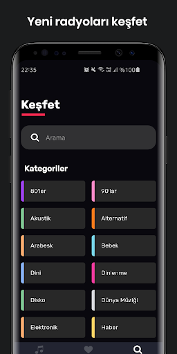 80s, 90s, akoestisch, alternatief, arabesk, religieus, rust, disco, wereldmuziek, economie, elektronica, volksmuziek, jazz, Campus, Zwarte Zee, klassieke muziek, lounge, nostalgisch, pop, rock, hip -hop, kunstenaar, langzaam, sport - nieuws, Turkse kunstmuziek, Turkse pop, vreemde radio's
