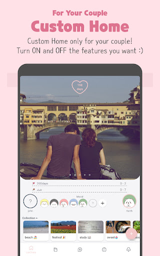 Custom home by turning on/off the features. From days in love to collection, you can change the home to suit your taste. You can also choose many pictures of your couple for the background.