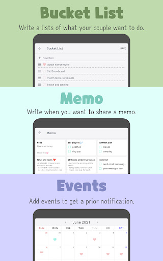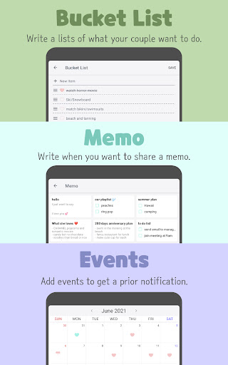 See how your heart is for each month. Heart will either empty, half, or full depending on your diaries. Important events will be shown and you can add new one. Choose the sticker that fits well to the event. Heart will be in mint color on the day of any event. Two most upcoming events' d-days are also on the home screen. Remind yourself for various anniversaries and events with your love.