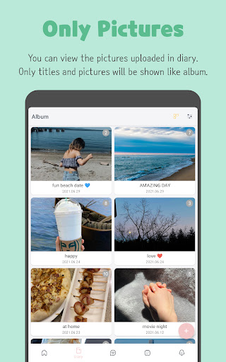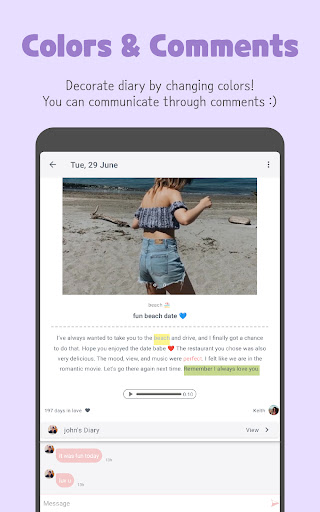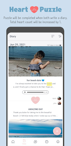 When you and your partner complete the diary, your heart count will increase by 1. You can check the total heart count at the home screen. If your love hasn't write today's diary, you can remind your love by clicking the "remind" button. Add pictures to give a vivid image of your day to your bf / gf. You can also communicate with your significant half by comments. Make your LuvDiary full of relationship memories with diaries.