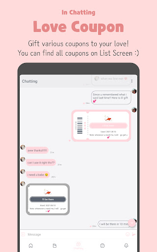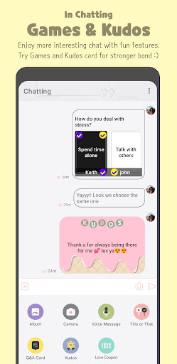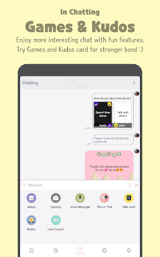 Talk with your significant half in your daily life. It's a secret and private chat only for you and your love. There is mini games and kudos card that can make a bond strogner. You can play This or That and QnA and get to know your partner's preferences. Also, keep your love's self-esteem high by sending Kudos card.