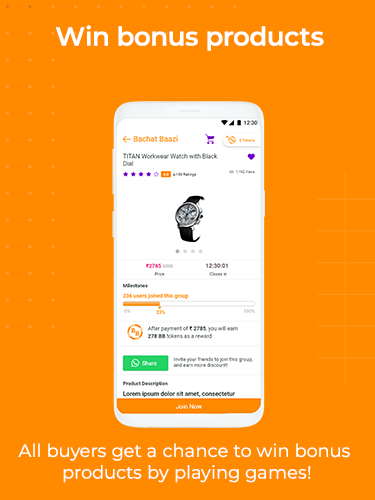 Browse through the catalogue and select your favourite product. The products sold on Bachat Baazi are 100% original and genuine. All product sales start at a discounted price. As the minimum number of buyers in a group is reached, every buyer gets a discount. At the end of the deal, the orders are processed for all buyers and free tokens are awarded to all buyers.