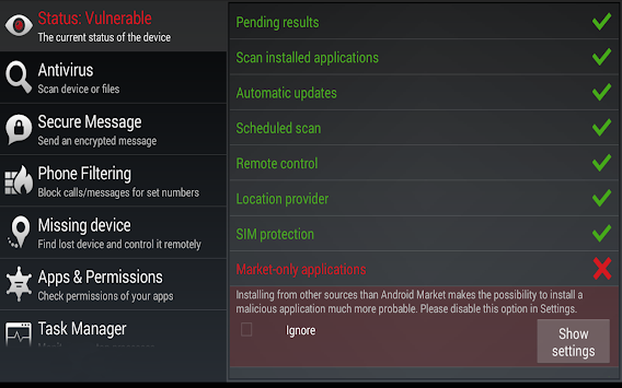 ✔ Protects against infected status, trojans, app vulnerabilities and WiFi based threats to your OS.