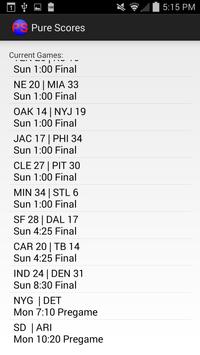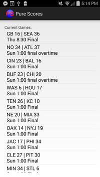 Lightweight scores program that feeds directly from NFL reported scores. Includes live scores, game status, time left, possession, red zone alerts, and score alerts for all games in the current week.