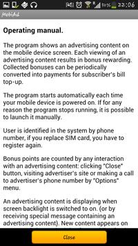 Amount of banners to be viewed depends on number of advertisers, therefore the more subscribers will install MobiAd, the more advertisements will be available and the more bonuses will fill in your personal account.