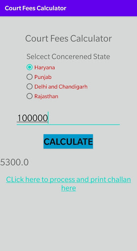 It is an app for the lawyers or the litigants to calculate the Ad-Valorem court fees which is to be deposited in favour of Courts for filing of some suits. They get the correct calculation here easily by just putting the amount to be calculated on and they get the result otherwise there is are different tables for calculating them. There are some government website where you can deposit the amount and the link appears at the bottom of it you just have to click it and it will get you to that website. The states and UTs for which this app calculates the court fees Haryana, Punjab ,Delhi, Rajasthan, Chandigarh,