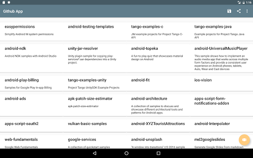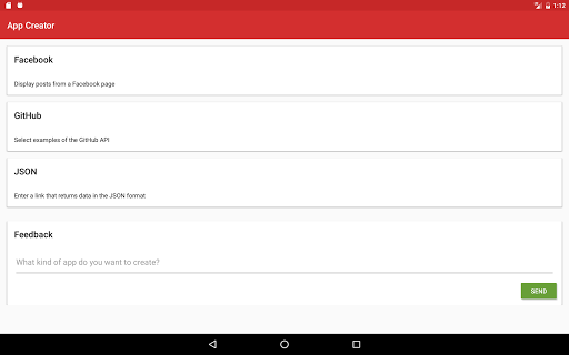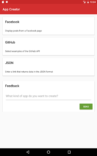 You can use data from Facebook, Github or any other data source in the JSON format or create your own content. Templates for Facebook and Github pages are already included. The created apps will use the Material Design specification for a consistent Android look and feel.