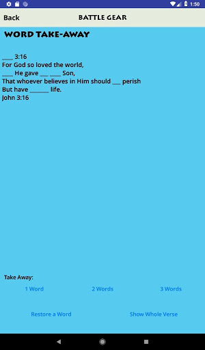 - Try memory activities such as Phrase (show a phrase at a time), Word Take-Away, and Initials (show just the first letter of each word in the verse)
