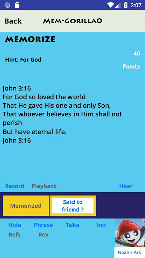 Parents and children will love memorizing verses in this Bible memory app that coordinates with the Awana Sparks HangGlider program. Includes all the Awana songs. Kids love the audio recording capability. Children can see, hear, record, sing and say verses and play several different activities to help them commit verses to memory. Tracks memory and review status for multiple participants and gives points for their memory/review activity. As reward, participants pick animals to "help Noah load the ark" and hear the animal sounds. You can search “BattleGearApps” or “Awana77” to find related apps.