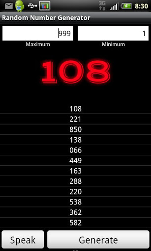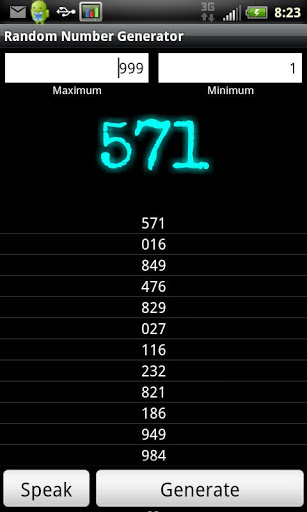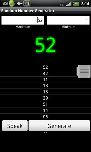 Generates and speaks one, or a list of many, nicely displayed RANDOM numbers from your specified maximum and minimum values - could be binary or large numbers.