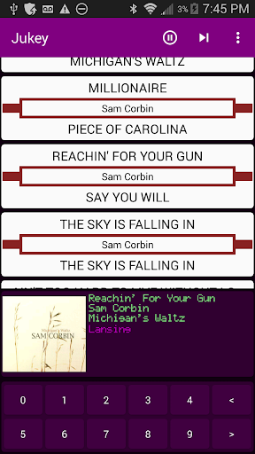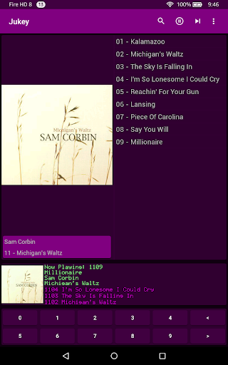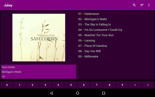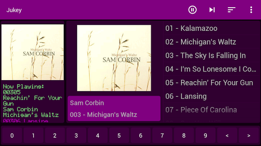 Jukey is a music player with a Jukebox interface. Browse your albums with the jukebox style buttons, or swipe actions. Select a song by tapping on the title or by entering the album index and song index with the on screen numbered buttons.