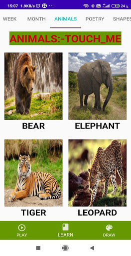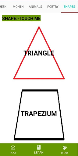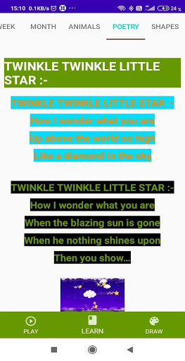 alphabate, week name, month name, shape name, poem etc are included in this application . And it will be better in the step of updates. developer team try to make this fully functional and try to cover entire syllabus of children school.