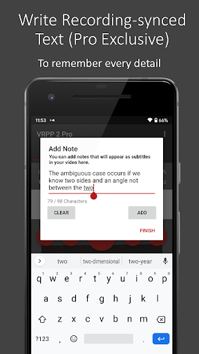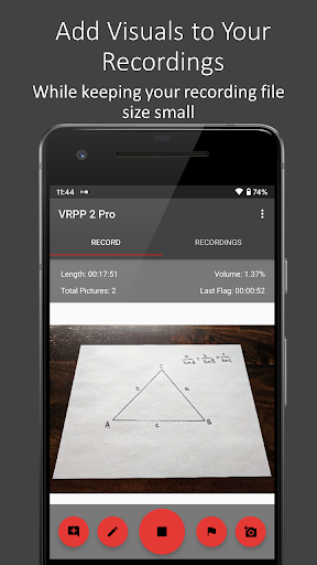 Voice Recorder Plus Pictures 2 Free (VRPP 2 Free) is an app designed to help people get more information than just an audio recording. VRPP 2 Free allows users to create long videos that contain all the important information you want without using up too much of your device’s storage or battery. VRPP 2 Free isn’t a replacement for conventional video, but shines while recording long slow-paced events where you would like visual information as well as audio to help you study or remember critical details. VRPP 2 Free also allows you to jump to the moments when pictures or flags were added during the recording so you can get to what is important to you quickly.