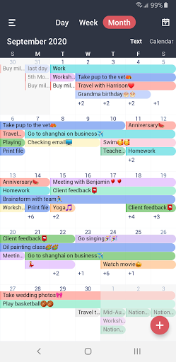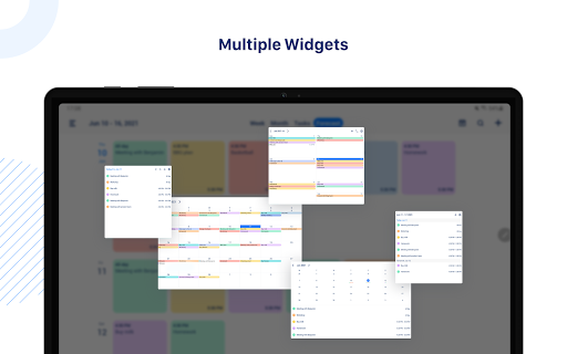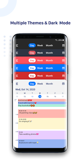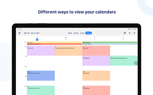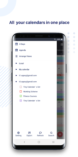 Tiny Calendar supports 8 standard views - day, week, month, 4-days, year, mini-month, week agenda and agenda. You can instantly switch views to discover events or find a time you're looking for.