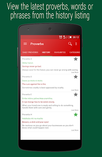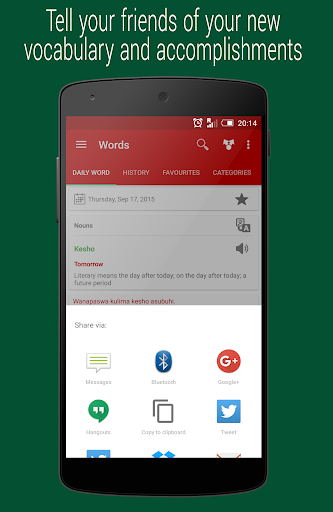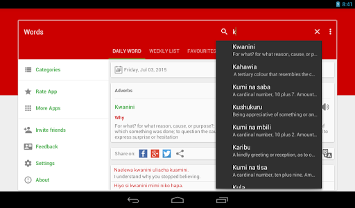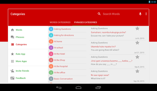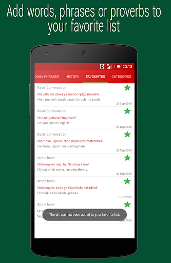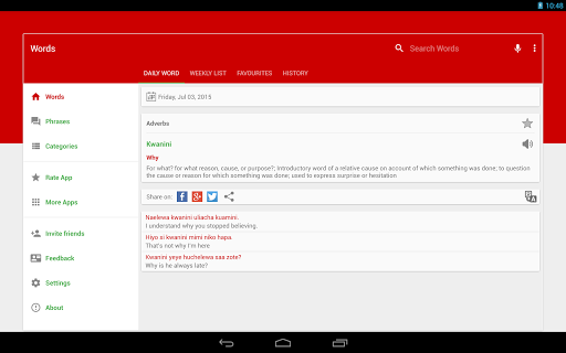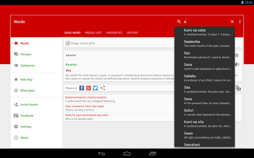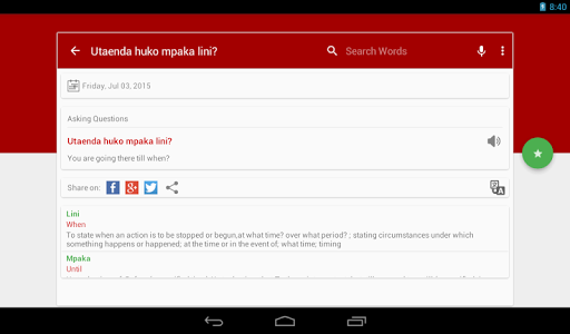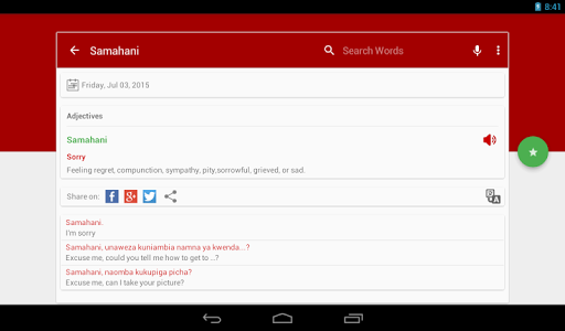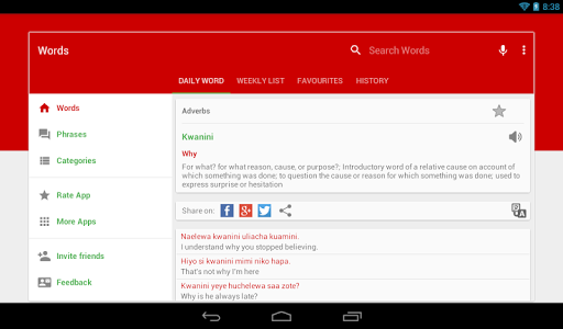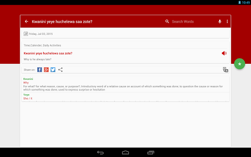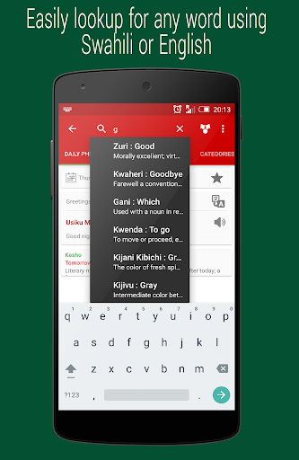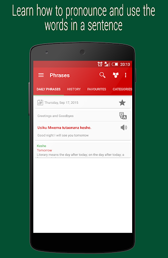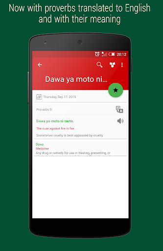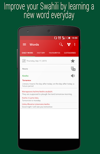 “Daily Swahili” contains the commonly used Swahili words proverbs, and phrases for beginners and intermediate learners. You will receive a notification with a new word or phrase daily. You can practice your speaking and listening skills with Swahili sounds, wherever and whenever you are. The words are linked to phrases making learning Swahili much easier as you get along with daily practice and review word usage.