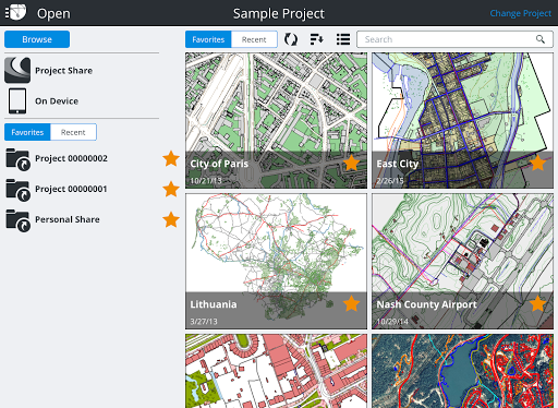• File Selection User Interface - A simple user interface provides new “Favorites”, “Recent”, “Browse” and “Connect Server” capabilities. Please note that the “Open > On Computer” lists i-models located in the users “Documents” folder. The “Favorites > Add Folder” command can be used to select additional locations that contain Bentley Map Mobile i-models.