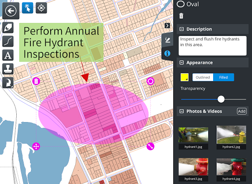 • Redlining - Users can create and manage one or more redline layers that can consist of vector based freehand sketches, simple geometries (e.g. circles, shapes, lines, arrows, clouds etc…), text annotation, symbols along with photo and video attachments. In Bentley Map Mobile one or more redline layers can be selected and packaged into a single .markupdb file then sent via e-mail, uploaded through Web Services Gateway to a ProjectWise repository or uploaded to your Bentley CONNECT Personal Share area for use in a Bentley Map desktop session.