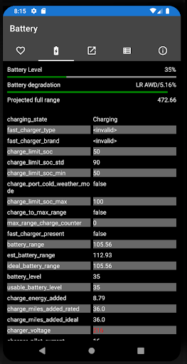 Shows all what you have to know about your battery status. Such as load level, degradation level, projected full range (The milage you will get when you load to 100%)