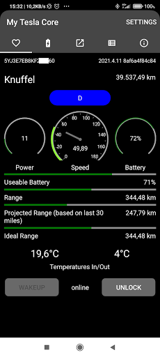Shows all important data of the car such as power, speed, battery level, range, temperatures in/out and so on.
