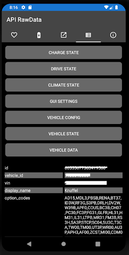charge state, drive state , climate state, gui settings, vehicle config and vehicle state.