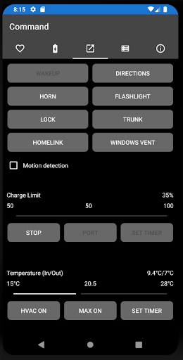 A subset of available commands such as Opening the car, Start and Stop Charging and a remote Control of the HVAC system (Climate Control).