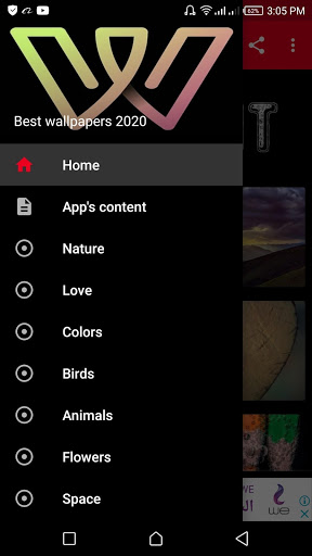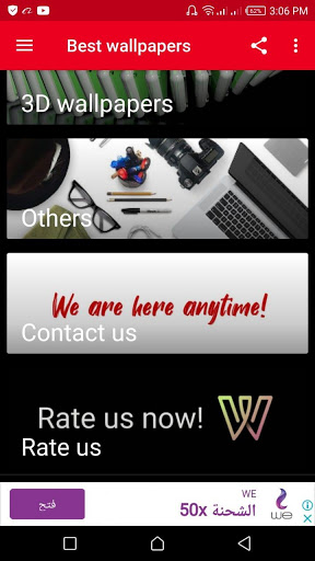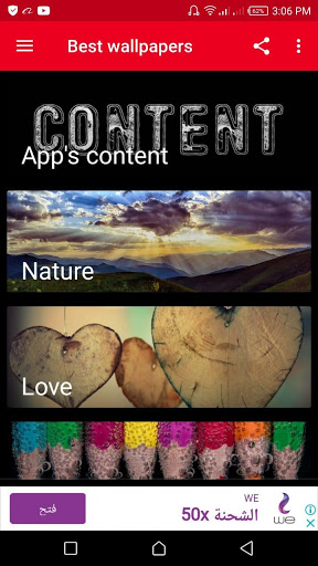 This app contains more than 560 wallpapers with a very high quality in more than 15 different categories such as Nature, Animals, Birds, Love, Space, Flowers, Colors, Letters, Cars, Football players, Technology, Dark, 3D wallpapers ...etc.