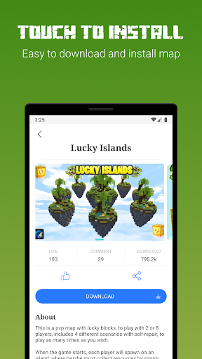 Just browse the map you like, then install to MineCraft PE in one click.