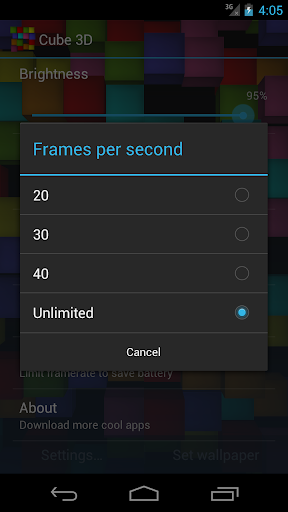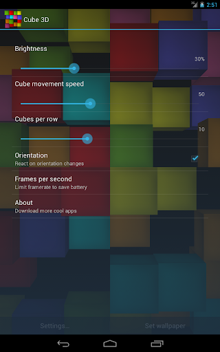 Visually smooth, battery friendly and pleasant 3D live wallpaper. Cube 3D is extremely lightweight, optimized for fast download and minimal footprint.