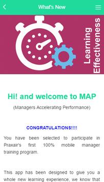 MAP Managers - Accelerating - Performance. A blended learning experience for global leaders who want aquire new skills through a unique mobile format that uses learning checkpoints such video based elearning topics with practical application on the job and live webinars per topic to support your learnings. MAP minimizes your time away from work and maximizes your learning experience. Working with a diverse group of senior executives, and a personal mobile leadership coach, you will expand your leadership skills, mindset, and network. Taking you to a new level of performance.
