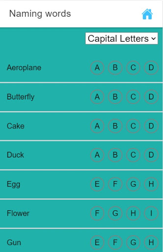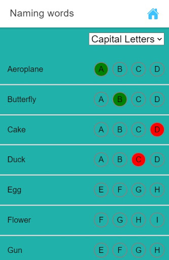 children can click/touch/press to the letter from given 4 options of the correct word. if the pressed letter is wrong then it will display in red background and if it true/right, it will display in blue, and audio will be played.