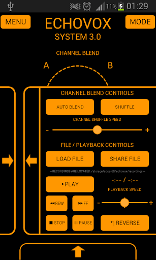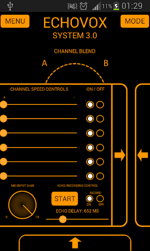 EchoVox is a real time amplified recording system used to create a bed of random chaotic noise using random phonetics, microphone input and a natural loop recording echo. Delay time can be set from anywhere to 0-10 seconds. This means what you are hearing is the actual audio being recorded to disk in real time, as it happens.