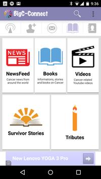 The BigC-Connect platform has been designed to help survivors of cancer on their journey to survival. The platform has a number of facets. It provides an update feed regarding day-to-day developments in individual cases. There's a messaging service enabling one-on-one dialogue between participants. It has an "explore" feature containing up-to-date information derived from news, books and video. Finally a story section for survivors to share stories and tributes. Big C-Connect will divert any profitable income from advertising and other sources to research enterprises around the globe performing vital work in the field.