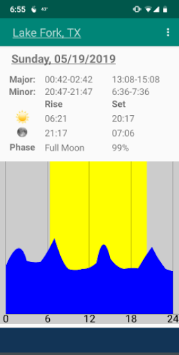 Fishcast uses a location and date to show you you the best periods of the day. Have a fishing vacation or tournament planned away from home? Fishcast can show you the best times for any location and date. The app shows sun and moon rise and set along with major and minor periods of activity. A graph of the day's activity is presented to make interpreting the data easy.