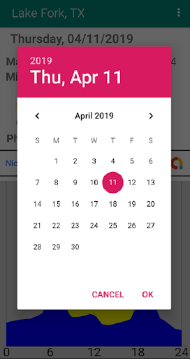 Fishcast is very easy to use. Tap on the location name to change locations or add another. Tap on the date to select another date or swipe left and right to change date by one day or swipe up and down to change date by one month.
