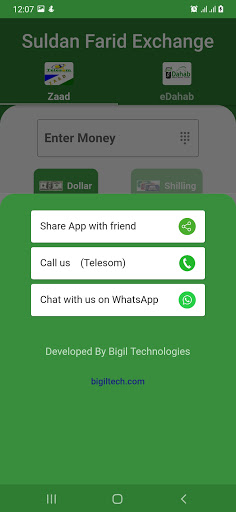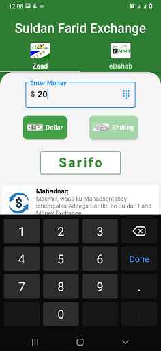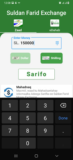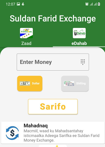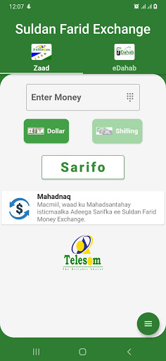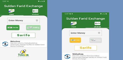 Suldan Farid Money Exchange App simplifies the exchange of money between Dollar and Somaliland Shilling accounts. Works with Zaad and eDahab. Supports single and dual SIMS.