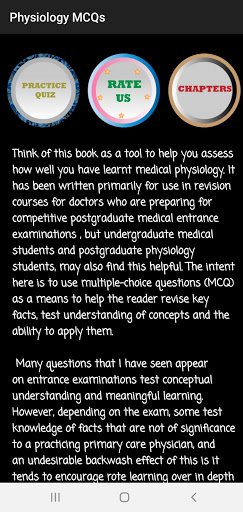 Think of this app as a tool to help you assess how well you have learnt medical physiology. It has been written primarily for doctors who are preparing for competitive postgraduate medical entrance examinations , but undergraduate medical students and postgraduate physiology