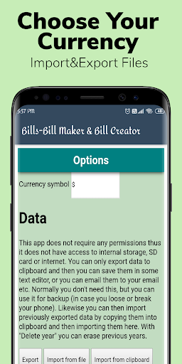 Bills Create is the leading app that lets you manage and organize your bills in one place. You can manage all of your utility bills etc., It allows you to customize the default options. (Currency, Reminder time, etc )as you wish. And you can create recurring bills to any date range. Bill create is a handy tool that helps you calculate and manage your bills easily and quickly. The bills you have created are stored in your phone's / tablet's local storage. Have you wondered how much you should pay for the meal at a restaurant, or for the weekly shopping at the supermarket, or how much more you should buy to enjoy a discount at a shop?. Share this bill Into Whatsapp, Facebook.you can also import and export files from your phone and tablet. You can also delete your bills.